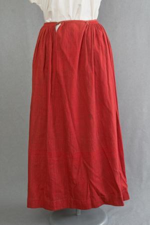 Rödrandig kjol, röd botten med smala svarta ränder, tätt rynkad, rynkorna genomdragna på två ställen.
