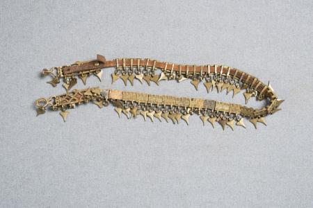 26 bleck med hjärta, sölja och knapplås med stämpel ”G Blomqvist” och genombrutet mönster. Välbevarat. L: 82 cm, H: bleck: 2 cm, sölja: 3 cm med ringen.