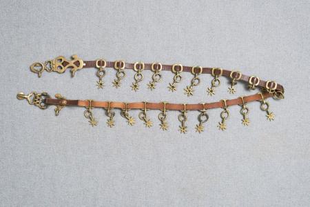 Kommentar: Bältet har genombrutna söljor med vidhängande stjärnhängen. B: 1,9 cm, H: 5,2 cm, knapplås: 16 cm, bältets längd: 92 cm.