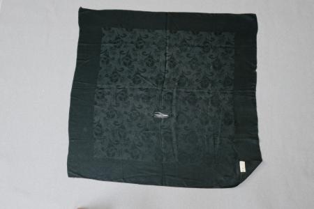 A21. En svartblommig sidenduk, söndrig. Kommentar: Svart mönstervävd, ylle med en slät bård runt kanterna, sliten i mitten. Maskinsydda fållar. 74 cm x 75 cm.