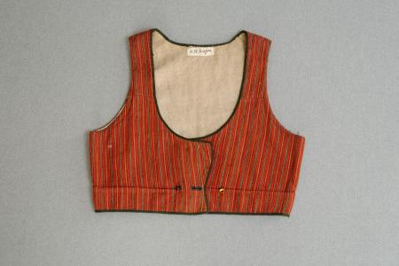 Litet skört i ryggen. Foder av grovt linnetyg. Båda axelbanden skarvade. Rosa spegelglasknappar och en träns och hake.