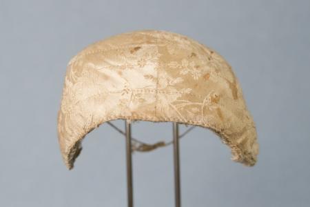 Bindmössa av ljusgult blommigt tyg utan rosett. Kallades ”Stockholmsmössa”” – mössor.