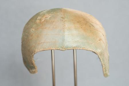 Framkanten nästan rak, fyra stickningar som dekor. Sex veck i vinkel. Foder av blekt linnelärft, skarvat, dragband av tvinnat lingarn. Mössan sned, smutsig, blekt och sliten. B: 16 cm, H: 8 cm.
