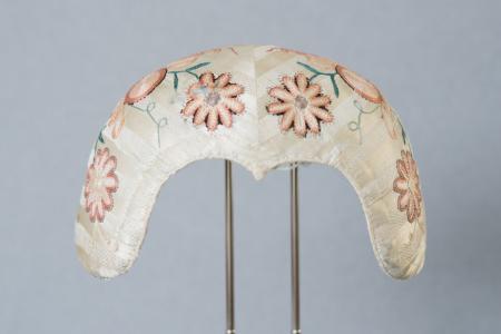 Broderad i tambursöm i ljusrosa bruna och gröna nyanser. Framkanten hjärtformad, kantad till avigan med vitt band. Fyra raka veck. Foder av linnelärft. Dragbanden av tvinnat lingarn. Framkanten något inböjd i sidorna, broderiet en aning upplöst. Skador