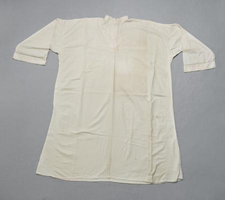 Lintyg (särk) med 3 cm hög uppstående krage med gans, upptill knäppes med 1 knapp, 5,5 cm brett motveck framtill, 17 cm sprund, ärmspjäll, något rynkat på axeln, jämnbreda ärmar utan linning, 1 cm bred hålsöm 3 cm från kanten, som pryds med en 1 cm bred spets.