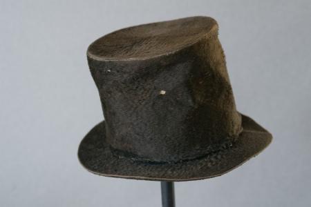 Mycket sliten, brättet lossnat nästan helt, svettremmen lös. B: 29 cm, H: 15 cm, brätte: 6 cm.