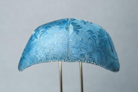 slät botten. Fyra stickningar i framkanten. Dragband av tvinnat lingarn. Foder av blårutig lärft. Sliten i kanterna, i övrigt väl bevarad. B: 17 cm, H: 6 cm.