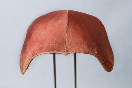 Bindmössa, mindre, röd, utan rosett, 4½ veck i vinkel.