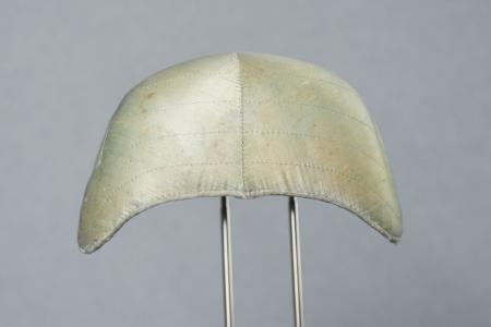 Liten, nästan rak modell, foder av blårandigt tunt linnetyg. Dragband av tvinnat lingarn.