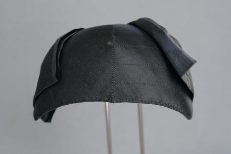 Bindmössa, svart med rosett, 6 veck i vinkel.