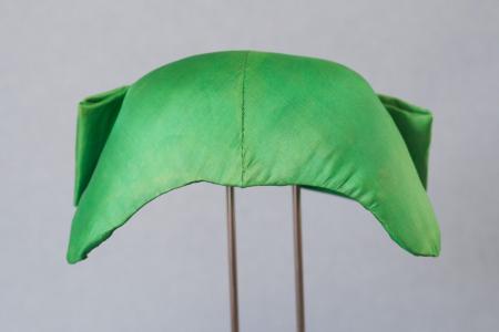 Bindmössa, stor, utan rosett, 6 veck i vinkel. Numera överklädd med grönt, med rosett.