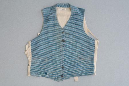 Väst av blåvitrutigt bomullstyg, utan krage, 6 benknappar i en rad, utan uppslag, maskin-sydda sömmar, fickhål 2 st. med sydda figurer, vit rygg med tampar o. spänne.