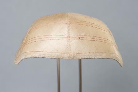 av tvinnat lingarn. Framtill foder av beige kattun med tryck i ljust/vitt. Dekorerad med stickningar i rosa, fyra grupper med tre rader stickningar i varje. Litet slitage baktill. B: 18 cm, H: 7 cm.