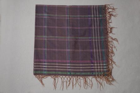 ”Sidenrutoschal” mörkblå botten, rutränder i grönt, blå-violett o. rött.