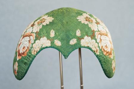 blommor på grön botten, hjärtformad framtill, en stickning och kantad framme med grönt sidenband mot avigan. Linnefoder, dragband av randigt sidenband. B: 19 cm, H: 9 cm.