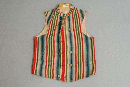 Väst av randigt mångskiftande tyg, uppstående krage, inga uppslag, 6 par platta släta mässingsknappar i lodräta rader, två raktsydda fickor, rygg av samma tyg, utan tränsar.