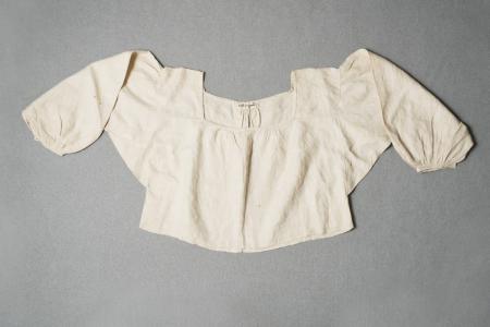 Lintyg med fyrkantigt huvudhål, smal fåll, något rynkad i nacken och på 2 ställen framtill, skilda axelstycken, ärmen vid ärmsömmen veckad i 6 grupper om 3 små veck, tätt rynkad vid den 1 cm smala linningen, som är broderad i vitt o. har 1 knapphål på var sida om sprundet, ena sidan av ärmen löper ned under armhålan o. bildar spjället, kort vid livet, stad nedtill.