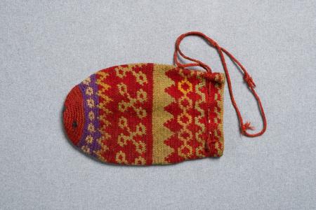 Penningpung, virkad i rött, grönt, gult, gredelint med röd dragsnodd.