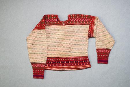 Tät mönstervirkad bård nertill, på axelpartierna, ärmuppsättning och nertill. Olika mönster med granna färger på röd botten. Resten stickat, vit botten med blåa och röda ”loppor”. Fyrkantigt halshål med ett litet sprund. Använd, dock bara litet sliten. B: 60 cm, H: 53 cm, ärm: 59 cm.
