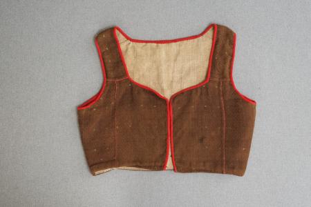 A161b Kvinnolivstycke av brunbottnigt kattun med vita prickar, låg, rund urringning framtill, röd bomullskantning kring urringning. Kommentar: Ett likadant liv som A160. Samma snitt och sömnadssätt, endast tyget annorlunda. Brunt halvylletyg med invävda prickar. B: 46 cm, H: 33 cm.