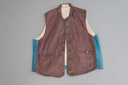 Mansväst av silkesrosatyg, snitt som Nr. 162, blå skirtingsrygg med tampar och spänne, hörnen nedtill något avskurna.