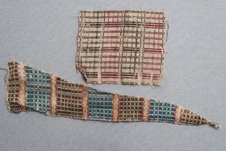 A175. 28.8.1925 Närpes Finby Prov på fälltäcke. Erhölls av Kajsa Håkans arvingar. Yngvar Heikel Kommentar: Klippta ur ett större täcke. Mönsterinslag brunt/natursvart, grönt, rött och blått. Närmast fragment, mycket slitet. B: 18 cm, H: 21 cm.