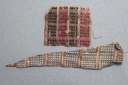 Klippta ur ett större täcke. Mönsterinslag brunt/natursvart, turkos grönt, rött och beige. Närmast fragment, mycket slitet. B: 13 cm, H: 50 cm.