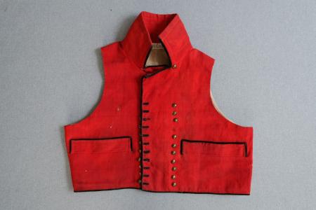 Väst av helrött tvåskafts tibet, 9 cm hög krage med nästan rätvinkliga hörn, 1+11 par gula kullriga knappar i parallella rader, raka hörn nedtill, kort, två fickor, svart sammetskant längs kragens o. västens framkanter o. nedtill knapphål o. längs fick-kanterna, knapphål tränsade i svart, vit rygg utan tränsar.
