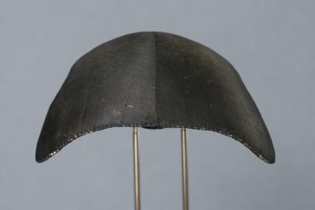 Svart sidenatlas. Nästan rak i kanten, fyra stickningar, fem veck i vinkel. Foder kypertvävd bomull. Dragband av tvinnat lingarn. Sliten i framkanten. B: 18 cm, H: 8 cm.