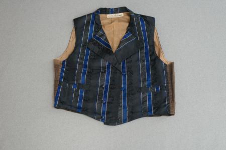 A205. 31.8.1926 Helsinge Botby Väst av svart och blåvitrandigt siden med invävda svarta blommor o. vattrade ränder på det svarta, nedvikt krage med trubbiga hörn, stora uppslag, 1+1+4 par överklädda knappar i konvergerande rader, 2 snett sydda fickor, svart bomullsrygg med tampar och 2 hål o. svarta snören. Inköpt av jordbrukaren Otto Åberg på Nissas gård i Botby. Yngvar Heikel Kommentar: Ryggstycket av mörkbrun bomull. Ryggstycket förstorat med ett bågformigt tygstycke. Foder av ljusbrunt bomullstyg. Kragen sliten i vikningen. B: 53 cm, H: 52 cm.