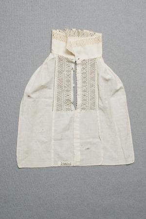 ”Nattkappo” för män med 7,5 cm hög krage, därav c.3 cm hålsöm, c. 14 cm bred o.17 cm hög hålsömsinsats framtill, sprund o. 4 pärlemoknappar på högra sidan, den översta på kragen, de övriga knäppbara genom dolda tränsar, 8 st. pärlemoknappar sydda på vänster sida till prydnad. Plagget c. 37 cm långt från halsen nedåt.