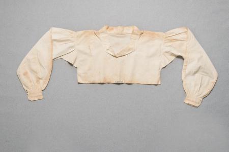 Bussaron med fyrkantigt huvudhål, utan sprund, med 4,5 cm uppstående fåll kring halshålet, ingen axelkokett, ärmspjäll, 8 grupper av små rynkor vid axeln, ärmen sneddad, rynkad vid ärmlinningen, som är 4,5 cm bred med en 1 cm bred hålsöm mittpå och en trådknapp vid övre kanten.