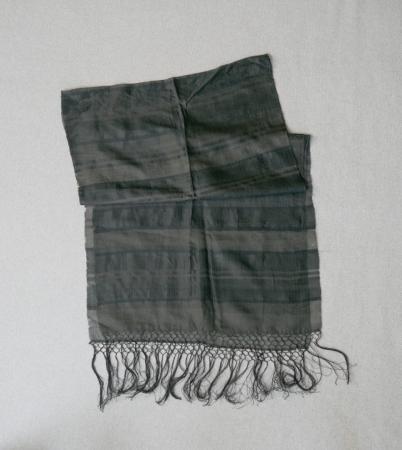 A228. ? Svart, randig, skir, avlång siden-duk med fransar i kortändarna. Kommentar: Tvärrandig med olika tjocklek på inslaget. Små färgförändringar. B: 46 cm, H: 174 cm + frans: 12 cm.
