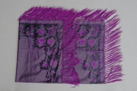 A235. ? Stor sidenschal med mörkgredelin botten, storblommigt mönster i hörnen och lång violett sidenfrans. Kommentar: Stadkant på sidorna. Stora revor mitt i duken, mindre revor i andra tygvikningar. B: 105 cm, B: 100 cm + frans: 16 cm.