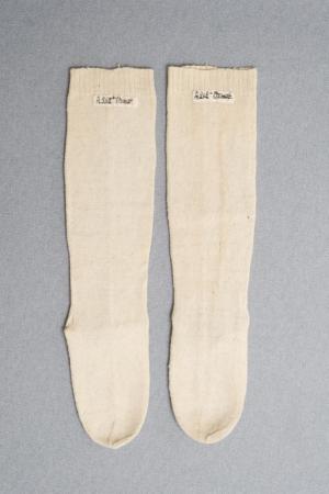 A262. dec . 1929 Ormsö Ett par strumpor. Tätt stickade strumpor i vitt ylle. Kommentar: Ojämn yta, handspunnet garn? Välbevarade. B: 12 cm, L: 54 cm.