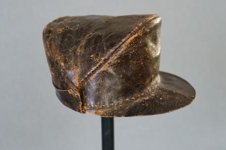 Läderkaskett sydd med skärm av läder o. kullen av 3 stycken (framstycke, upptill och bak-stycke) samt uppstående läderkant bakom o. på