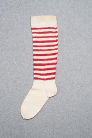 A273. okt. 1928 ? Barnstrumpa tvärrandig i vitt och rött med naggade ränder. Donation som föregående. Kommentar: Bomullsstrumpa av fint garn. Välbevarad. B: 8 cm, H: 33 cm.