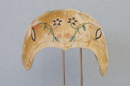 Mycket stor blekgul bindmössa med tamburbroderi (jämför A295). Hjärtformad framkant med en stickning. Kantad med smalt band i mössans färg. Vitt linnefoder, fyra raka veck. Dragband av vikt tyg (fodertyg). Stoppning av kardat lin och ull. Mycket sliten, trasig i kanterna, tyget sönder. B: 15 cm, H: 10 cm.