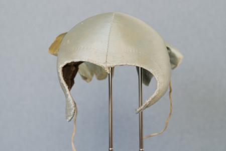 Bindmössa av ljusturkost siden, hjärtformad framtill. En stickning i framkanten, framkanten kantad med smalt band, tre raka veck. Foder