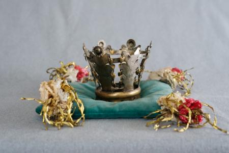 Brudkronan av försilvrad mässingsplåt. Ekblad med hjärtan, ett hjärta fattas och ett av bladen har bruten topp.