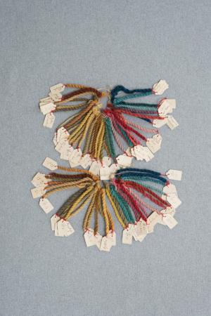 Garnprover, två buntar med textlappar från Brages gamla förråd. 72 olika färgnyanser av växtfärgat garn, varje färg har nummerlapp med information om växter och betningsmedel.