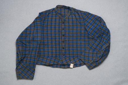Kommentar: Blårutigt halvylletyg i kypertvariation. Kantad med samma tyg men på snedden. B: 44 cm, H: 49 cm, ärm: 53 cm.