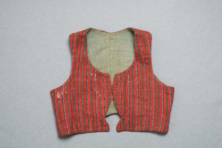 Liv av randigt halvylletyg, smala ränder i grönt och svart på röd botten. Hög i ryggen, snörning