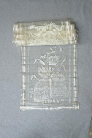 Kommentar: Tunt sidentyg med satinränder och inplockade mönster vitt på vitt. Lapp med lång historia. 43 cm x 235 cm. Tillhört Maria Svanström, född 26.3.1801 i Nagu.
