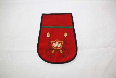 Kjolsäck, röd botten, svarta kanter, en grön kant, broderad. Från Kyrkslätt.