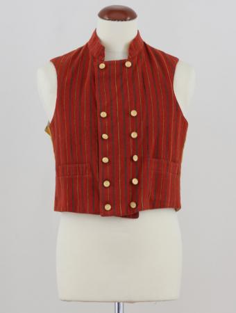 Heikels ursprungliga anteckning: Väst av randigt tyg i tegelrött med ränder i grönt, svart och gult med uppstående krage, inga uppslag, 6 par gula lodräta mässingsknappar, två rakt syddda fickor, gul shirtingsrygg.
