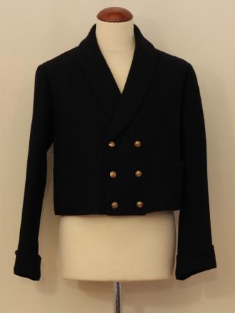 Rocken av mörkblå vadmal med sjalkrage. Dubbla rader av ankarknappar. Ryggen har mittsöm och svängda sidsömmar, som slutar i skörtveck med ankarknappar ovanom vecket. Ärmarna har uppslag med ankarknappar.