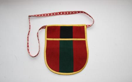 Kjolsäck sydd av lappar i rött, svart och grönt och med gula kanter, vävt band. Från Malax.