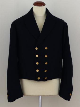 Heikels ursprungliga anteckning: Rock av mörkblå vadmal, nedvikt krage, som går långt ned i avsmalnande båge, 5 par mässingsknappar i två rader, som närma sig varandra, ärmuppslaget med en liten knapp genom uppslaget, ingen mittelsöm, skörtveck vid de svängda sidosömmarna, 2 par knappar vid skörtvecken.