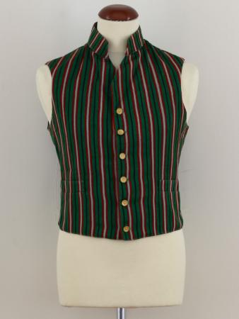 Väst, utan kanppar, med gröna bottnar och symmetriska ränder i rödblommigt, rött, gult, och grönt, uppstående krage, uppslag med en knapp knäppt genom vartdera uppslaget, dessutom 4 par små mässingsknappar i två rader, 2 rakt sydda fickor, samma tyg i ryggen, röda snören. Från Hitis eller Kyrkosundsskär.